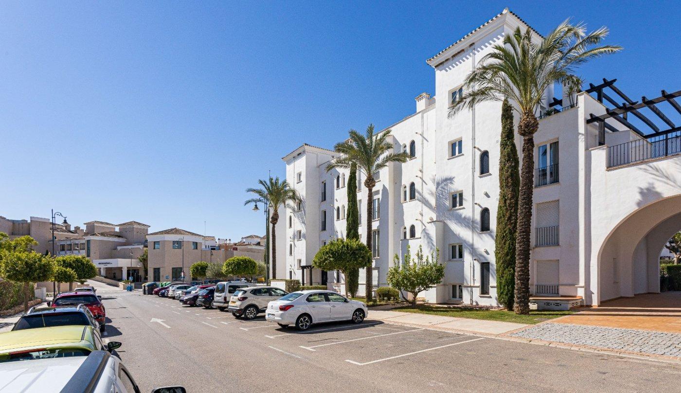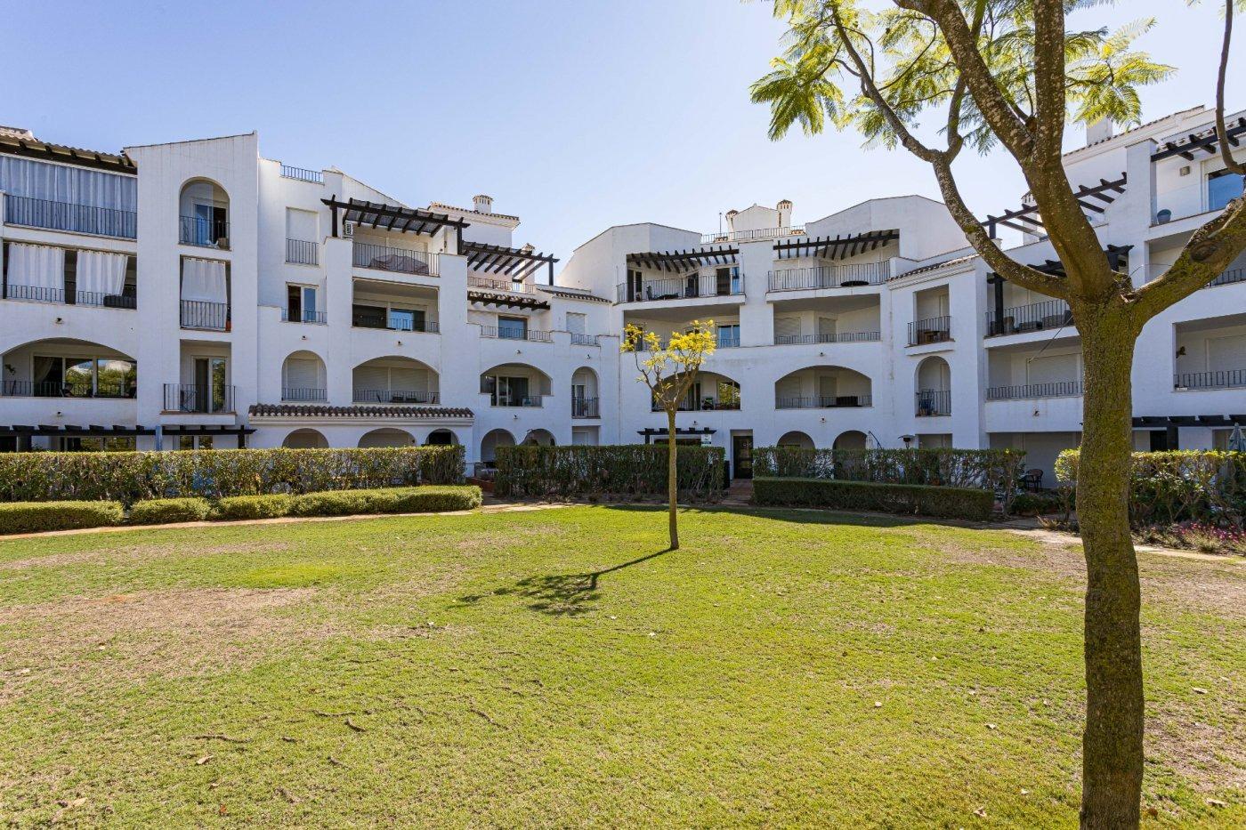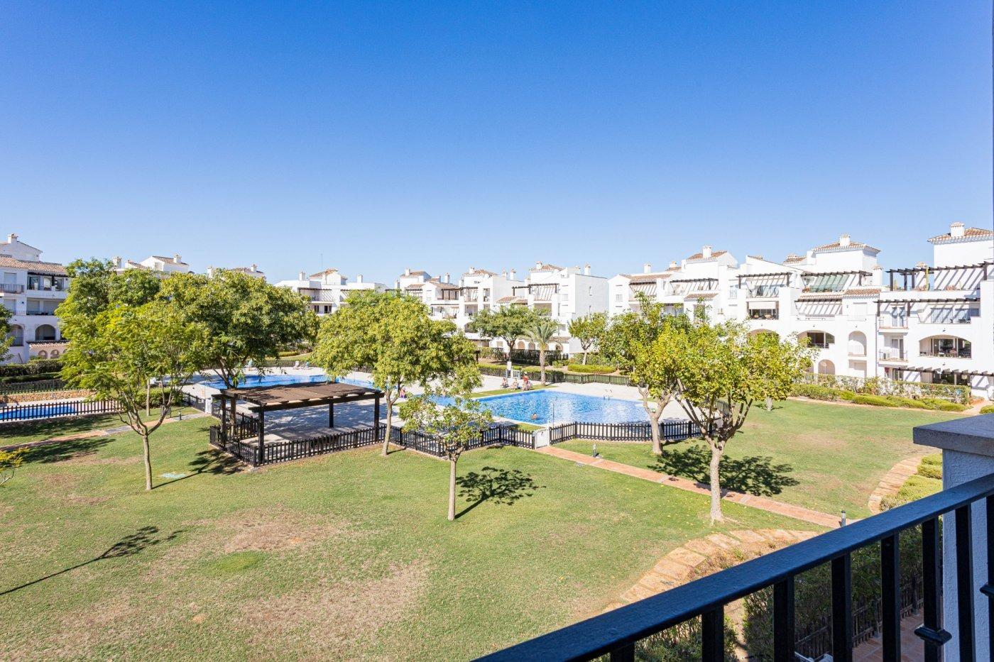 Luminoso y acogedor apartamento de 2 dormitorios, ubicado en la entrada de La Torre Golf Resort (Murcia), una zona en auge, junto al DoubleTree by Hilton, supermercado, zona comercial y todos los servicios.~~La vivienda se encuentra recién pintada y repasada, en muy buen estado, lista para entrar a vivir desde el primer día, sin necesidad de reformas.~~Dispone de:~~🛏 Dos dormitorios con armarios empotrados y ventiladores de techo.~~🛋 Salón-comedor amplio y cómodo, con aire acondicionado, WIFI y sofá cama.~~🌞 Terraza privada con toldo, con vistas despejadas a la piscina y jardines comunitarios.~~🍽 Cocina independiente totalmente equipada, con lavadero.~~🛁 Baño completamente reformado, con todo nuevo (grifería, espejo, muebles, apliques, mampara, plato de ducha, etc.), acabados modernos y diseño actual, un espacio renovado que aporta confort y valor a la vivienda.~~🚗 Plaza de garaje subterránea incluida.~~Piscina comunitaria rodeada de zonas verdes, visible desde el salón, dormitorio principal y terraza, creando un ambiente de tranquilidad y descanso durante todo el año.~~Ideal como residencia habitual, vivienda vacacional o inversión.~Resort con seguridad 24h, entorno cuidado y excelente clima.~~💶 Gastos:~~IBI: 348 €.~~Comunidad: 143 €.~~📞 Una vivienda cómoda, actual y lista para disfrutar. Contacta y ven a verla.~~~Información importante para compradores e intermediarios:~~Los propietarios han confiado en nosotros para gestionar la venta de su hogar, uno de sus bienes más preciados. Esto supone una garantía para ti como comprador: contarás con un servicio profesional, trato directo y sin intermediarios innecesarios.~~Por ello, te rogamos que, en caso de interés, contactes directamente con nosotros. No contactes con los propietarios; estamos aquí para acompañarte durante todo el proceso y facilitarte toda la información y documentación necesaria.~~Si eres agente inmobiliario y tienes un cliente potencialmente interesado, estaremos encantados de colaborar contigo.~~Notas legales:~~Gastos de compraventa y honorarios de agencia no incluidos en el precio de venta.~Los precios y ofertas publicados no son vinculantes y pueden estar sujetos a cambios.~